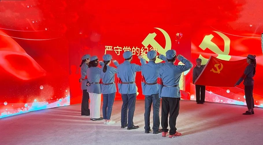 活動(dòng)伊始,黨員們換上紅軍軍裝,仿佛穿越時(shí)空,重回記憶中的紅色光輝歲月。他們?cè)谔摂M制作體驗(yàn)區(qū)的LED環(huán)幕前,齊聲重溫入黨誓詞,堅(jiān)定理想信念。