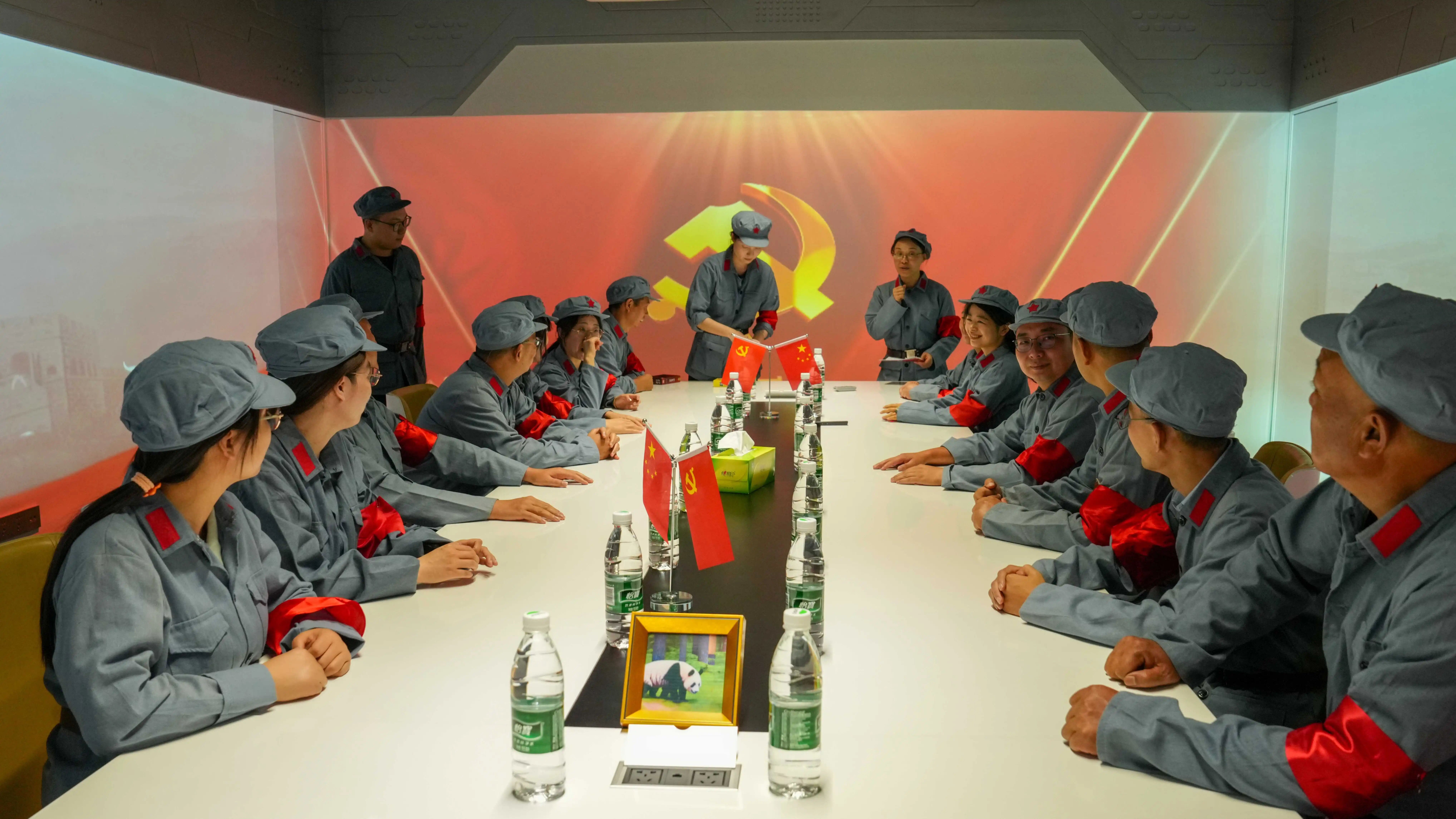 活動(dòng)伊始,黨員們換上整齊的紅軍軍裝,仿佛穿越回那個(gè)烽火年代。在虛擬制作體驗(yàn)區(qū)的LED環(huán)幕前,《長(zhǎng)征前的秘密協(xié)議》徐徐上演,波瀾壯闊的畫面與震撼的音效將大家?guī)腴L(zhǎng)征出發(fā)前的緊要關(guān)頭,信仰的力量在光影交織中鮮明躍動(dòng)。