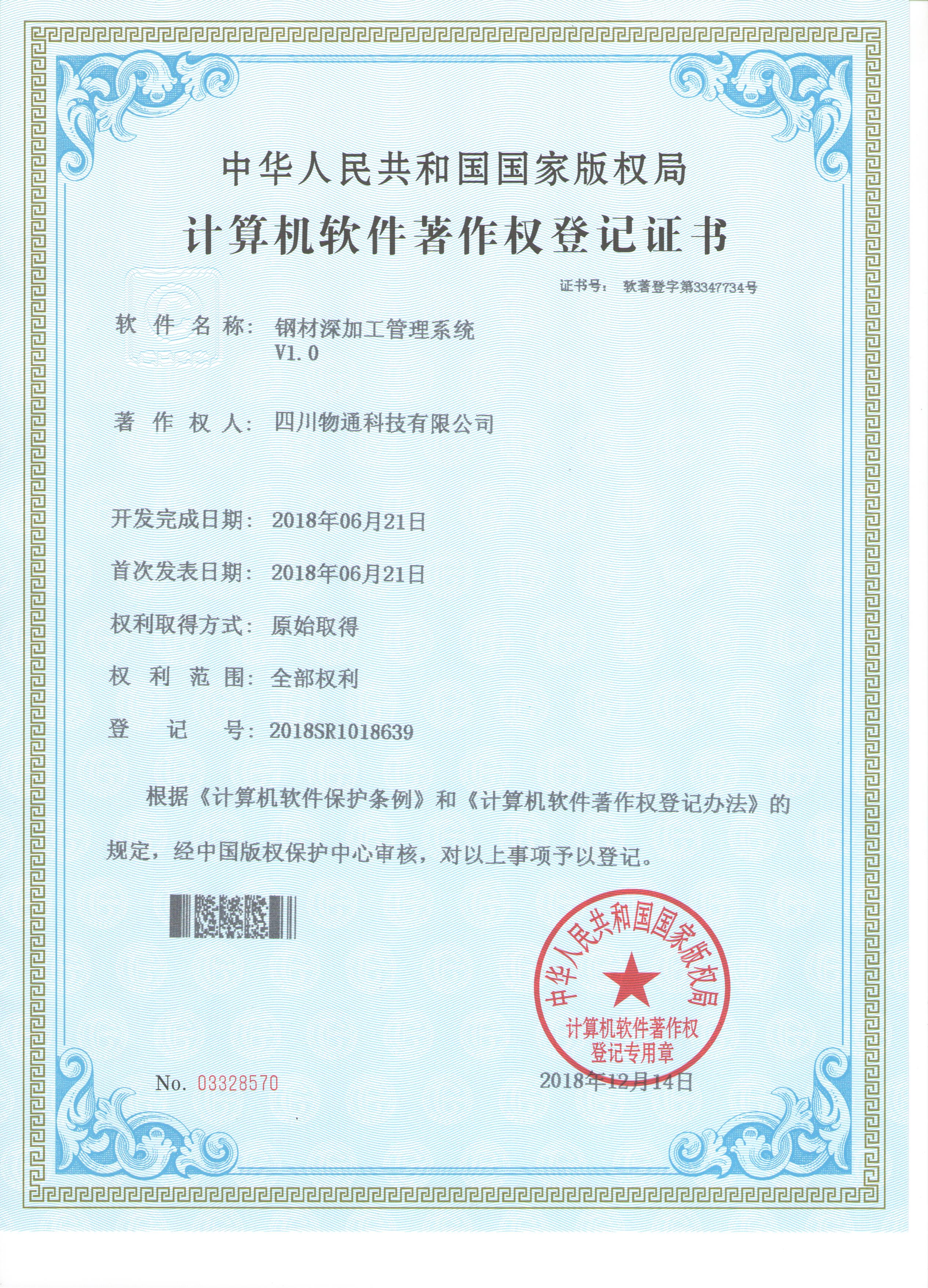 四川物通科技集團(tuán)有限公司技術(shù)部成功申請三項(xiàng)計(jì)算機(jī)軟件著作權(quán)登記證書:《鋼材深加工管理系統(tǒng)》、《基于客戶應(yīng)用信息處理技術(shù)的數(shù)字化倉儲(chǔ)物流...